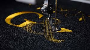 Close‑up of a stitched logo on a cap and uniform jacket, premium thread detail, tactile texture, professional look.
